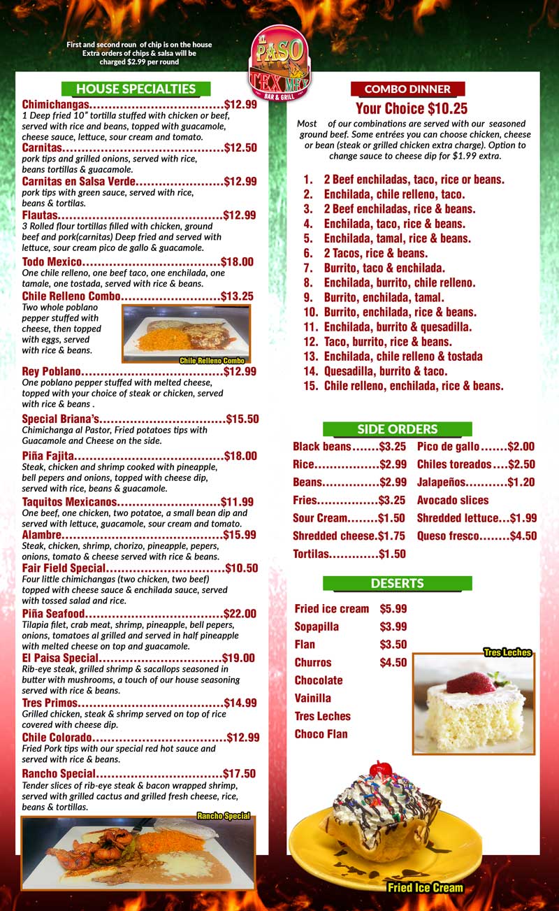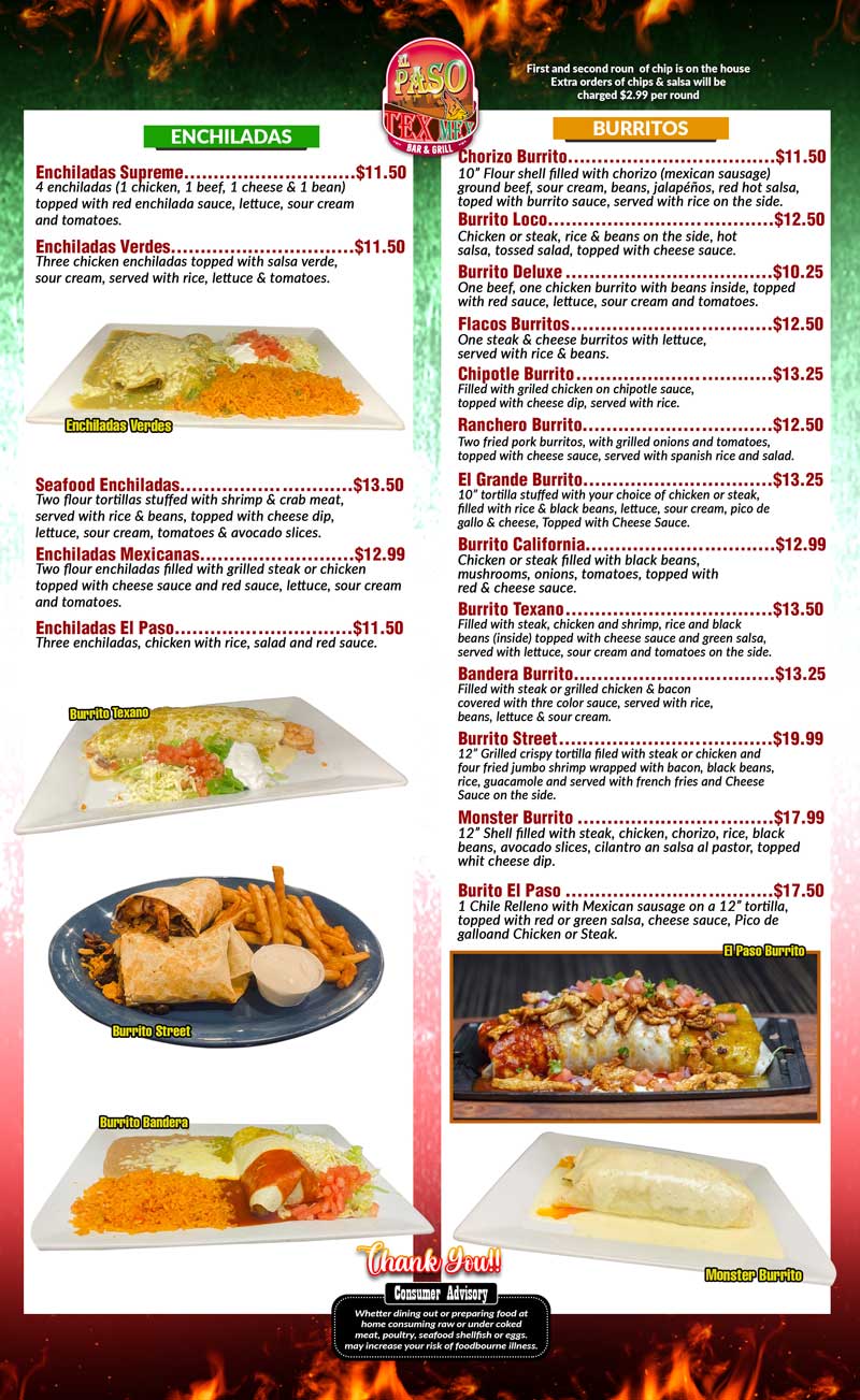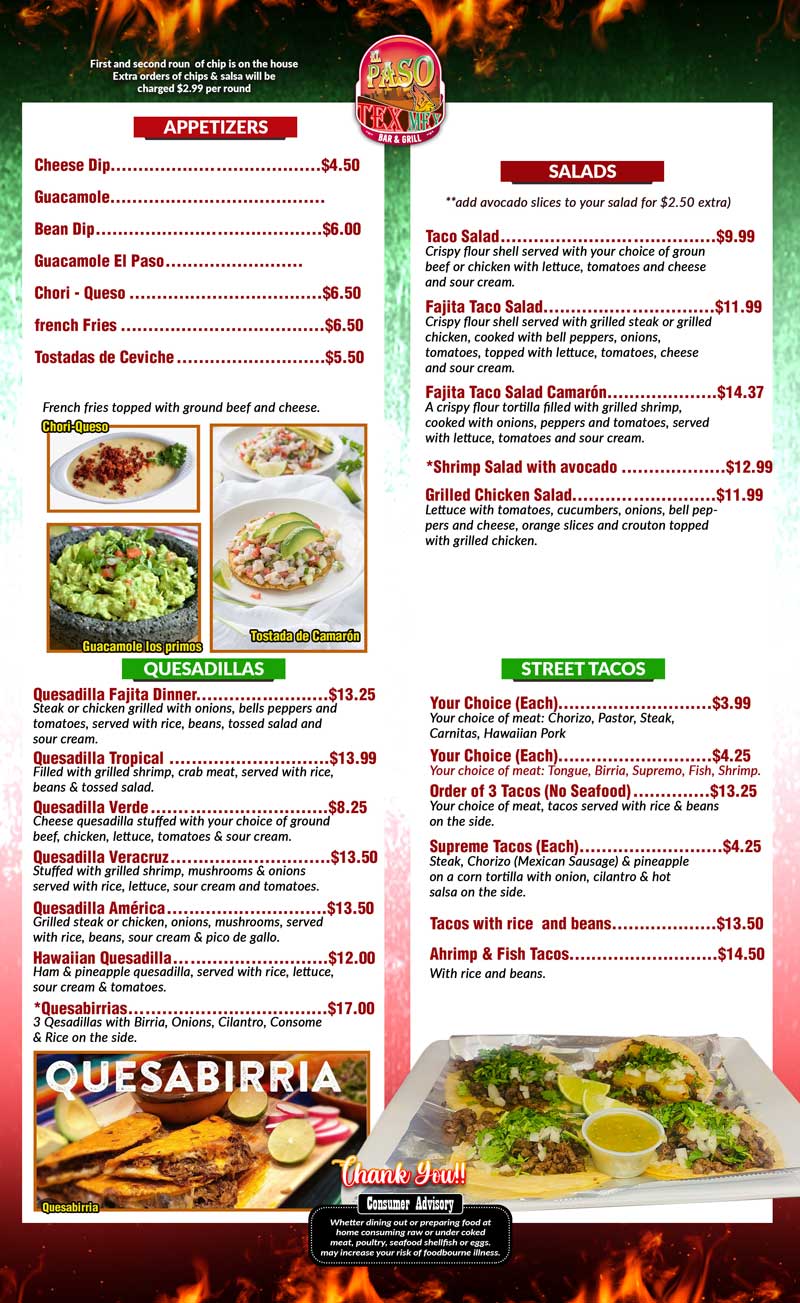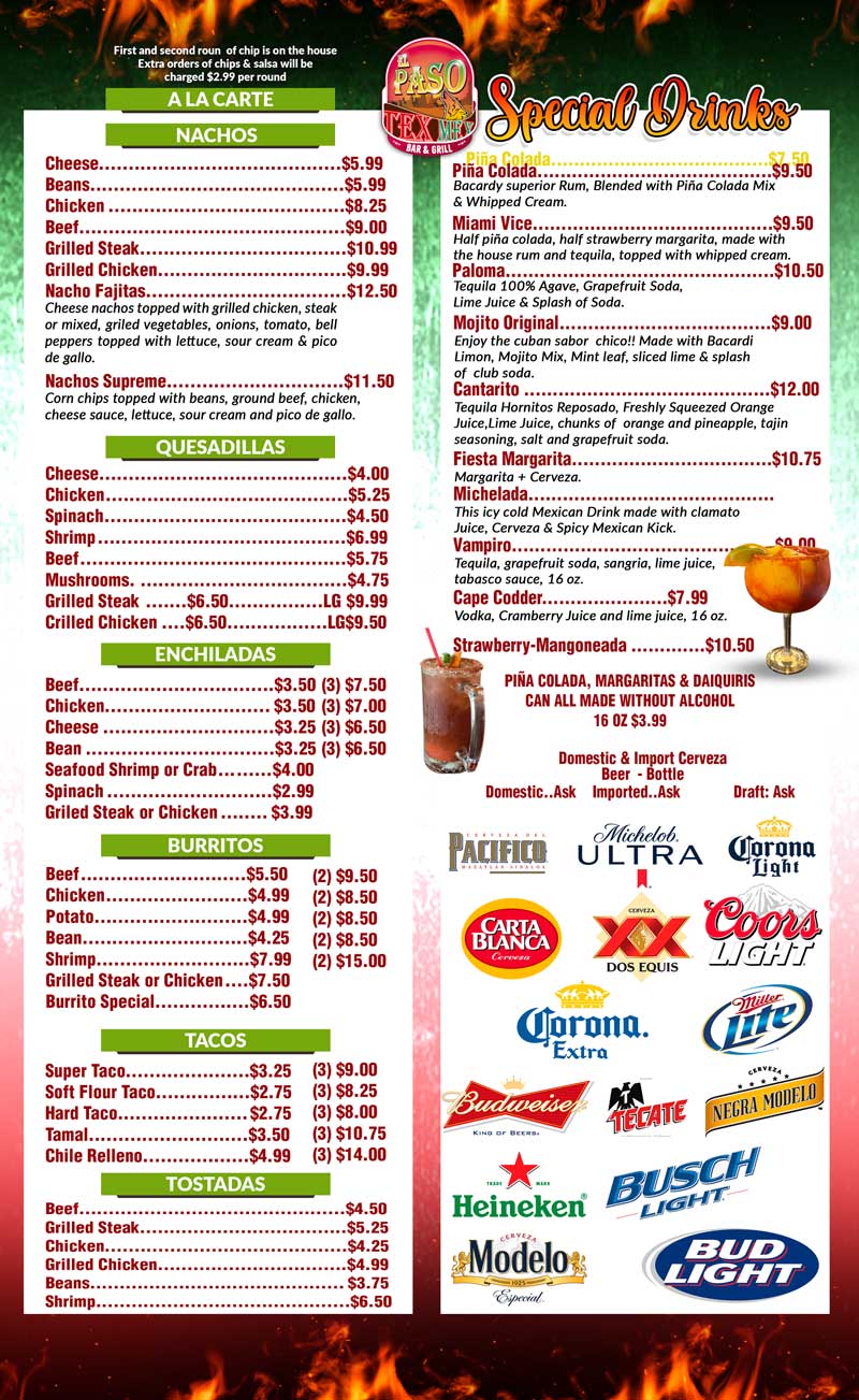 El Paso Tex Mex Bar & Grill is now open to the public. Feel free to visit us and enjoy the best Mexican cuisine in Fairfield Iowa. Please feel to browse through our menu. You can come dine, call us or place your order online for carry out.